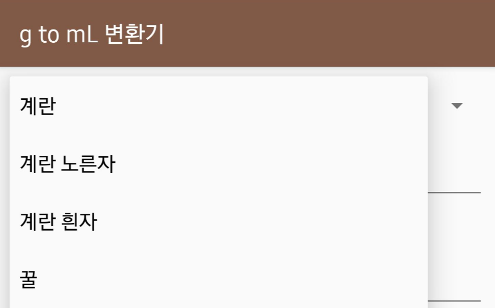 처음 Playstore에 등록했던 앱인 g to mL 변환기에서 변환 대상 항목을 설정하기 위한 View로 Spinner를 채택했다. 많은 공간을 차지하지 않고 다양한 항목을 보여줄 수 있어 다양한 용도로 활용이 가능하다.