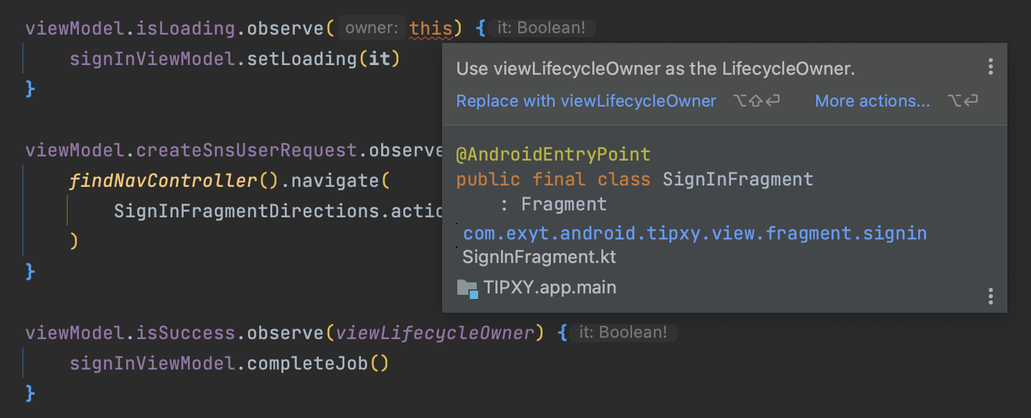 심지어 DataBinding의 lifecycleOwner에는 정상적으로 잘 들어가지만 observe에서 사용할 때만 빨간줄로 에러가 표시된다.