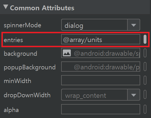 그리고 앞에서 넣어준 spinner의 entries Attribute에서 해당 array를 넣어주면 된다.