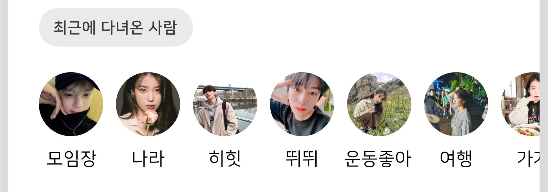 구현을 하다보면 위 사진처럼 RecyclerView의 첫 번째 아이템에만 간격을 주고싶을 때가 있다. 하지만 이럴 때 RecyclerView의 왼쪽에 Margin을 주는 방식으로 구현한다면 스크롤이 잘리게 돼서 모양이 안 예쁘다.